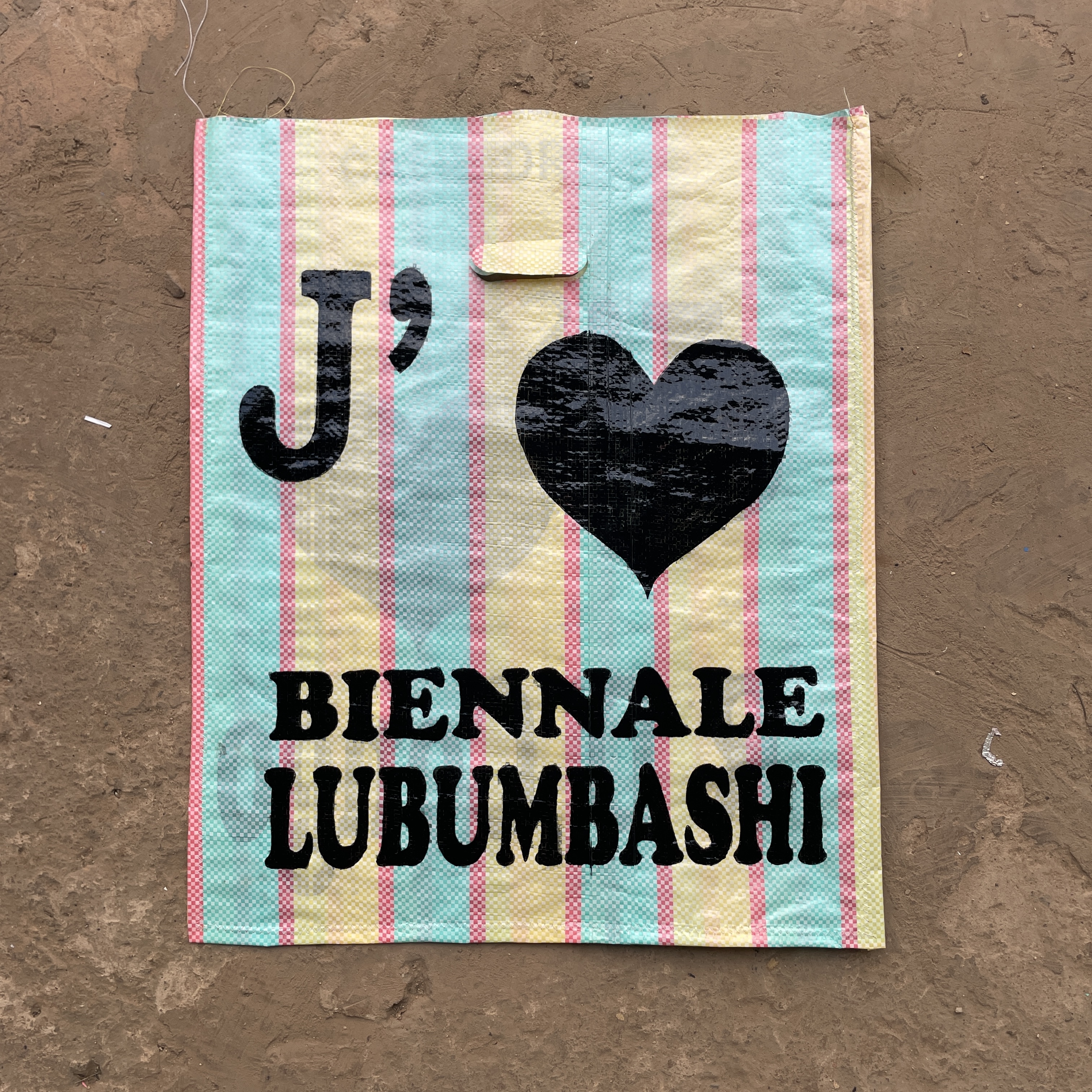 Lafleur & Bogaert reimagined the iconic “J’aime RD Congo” bags by turning them inside out and hand-painting new messages on them. These transformed bags became the official tote bags of the Biennale de Lubumbashi. Each bag carries, on one side, a slogan collected from street interviews, and on the other, the inscription “Biennale de Lubumbashi,” establishing a direct connection between contemporary art and everyday life.